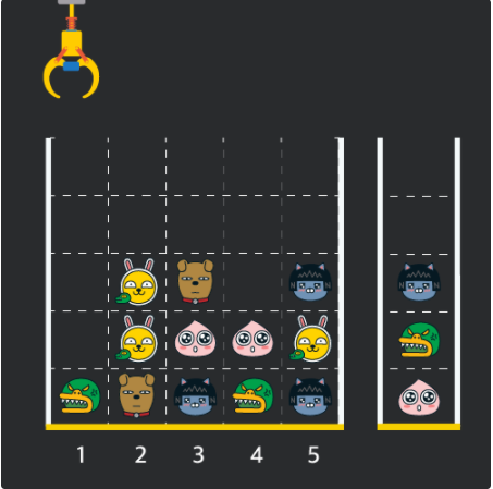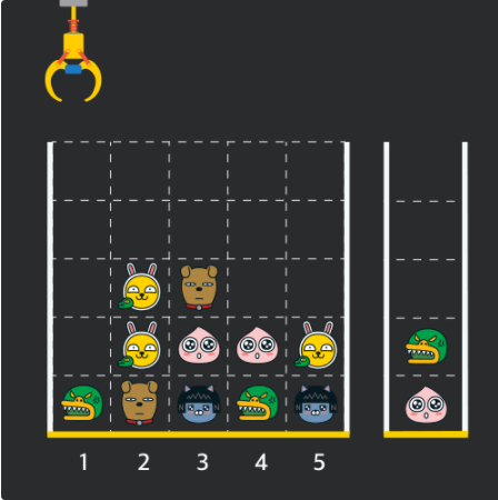 크레인 작동 시 인형이 집어지지 않는 경우는 없으나 만약 인형이 없는 곳에서 크레인을 작동시키는 경우에는 아무런 일도 일어나지 않습니다. 또한 바구니는 모든 인형이 들어갈 수 있을 만큼 충분히 크다고 가정합니다. (그림에서는 화면표시 제약으로 5칸만으로 표현하였음)