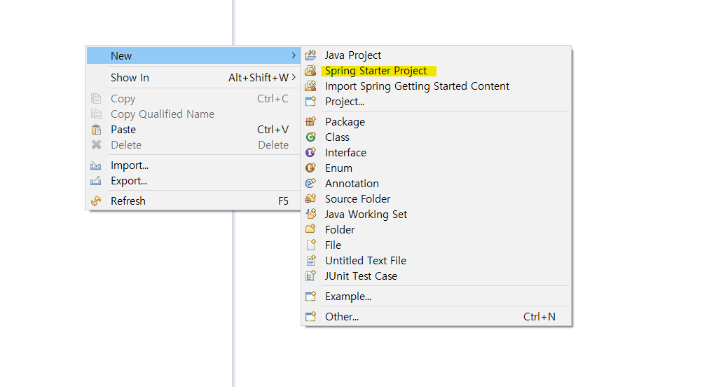 프로젝트 [File] - [New] - [Spring Starter Project] 클릭