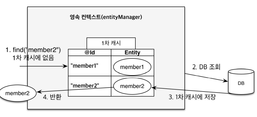 그 이유는 영속성 컨텍스트에서 1차 캐시를 지원하기 때문이다. 위에 persist를 이용하여 저장한 데이터를 캐시에 담아두고있다가 캐시에 값이 존재하면 그 값을 반환해준다.