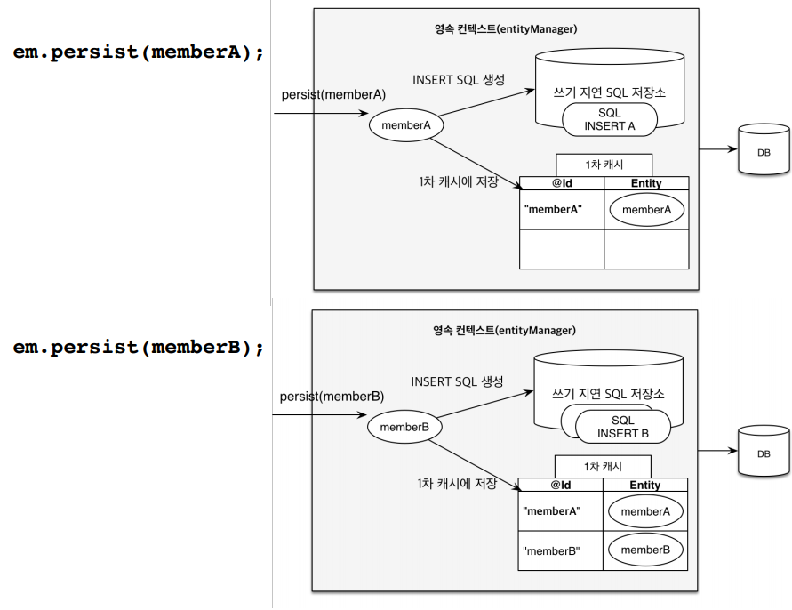DB에 저장하기위해 persist로 member의 값을 보내지만 바로 DB에 저장되는 것이 아니고 쓰기 지연 SQL 저장소에 쿼리를 생성해서 저장해두고 transaction.commit() 시점에 쿼리를 날려 저장해준다!
