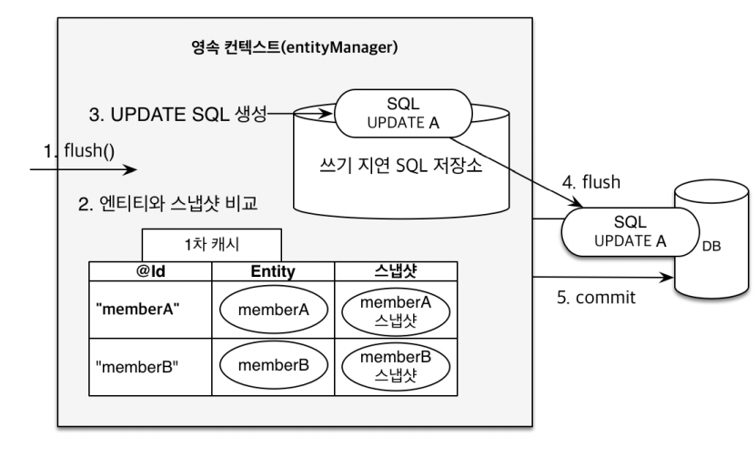 - EntityManager.persist(entity); persist는 우리가 DB에 저장하는 것으로 알고있지만 실제로는 엔티티를 영속성 컨테스트라는 곳에 저장하는 것
