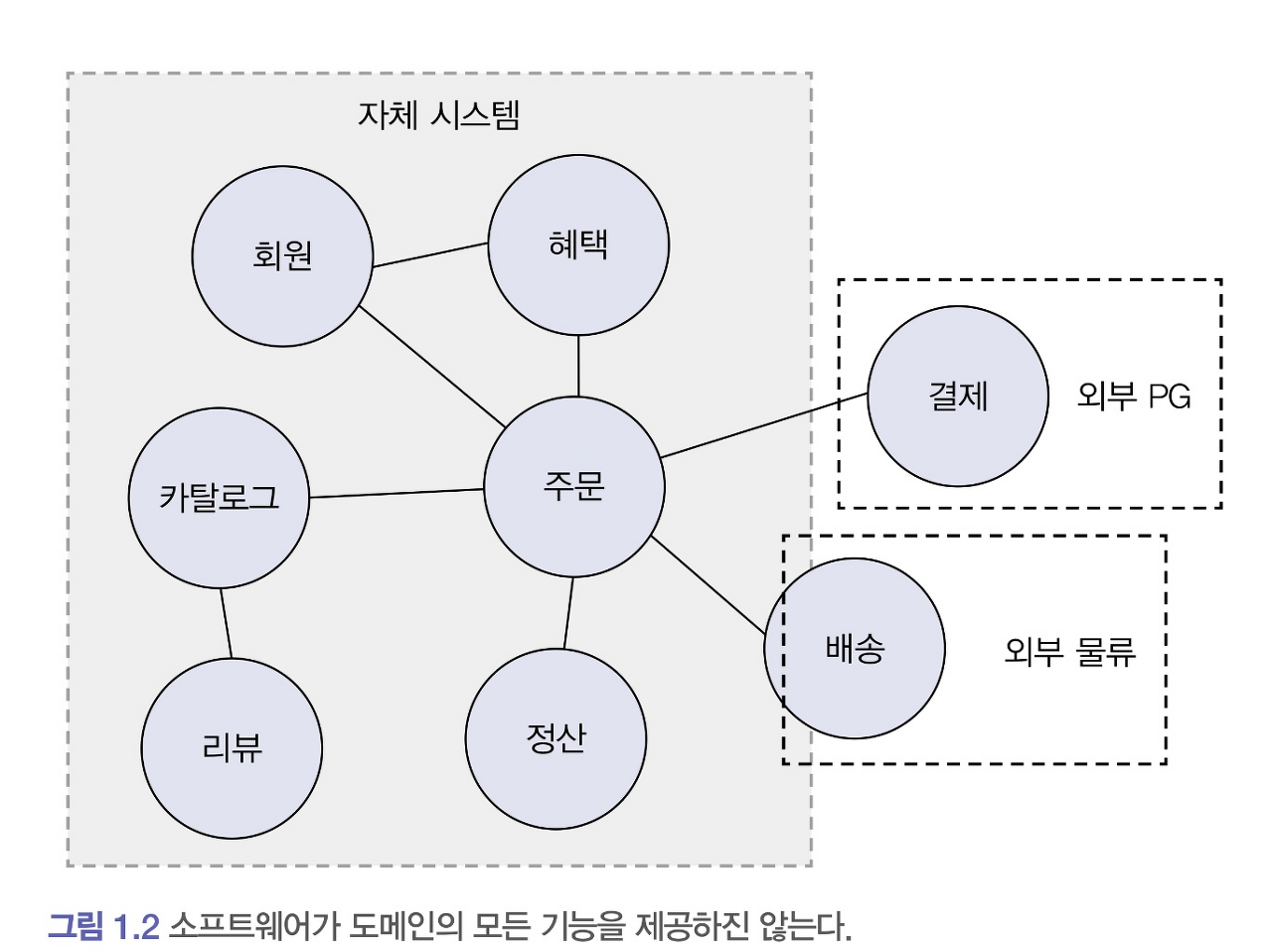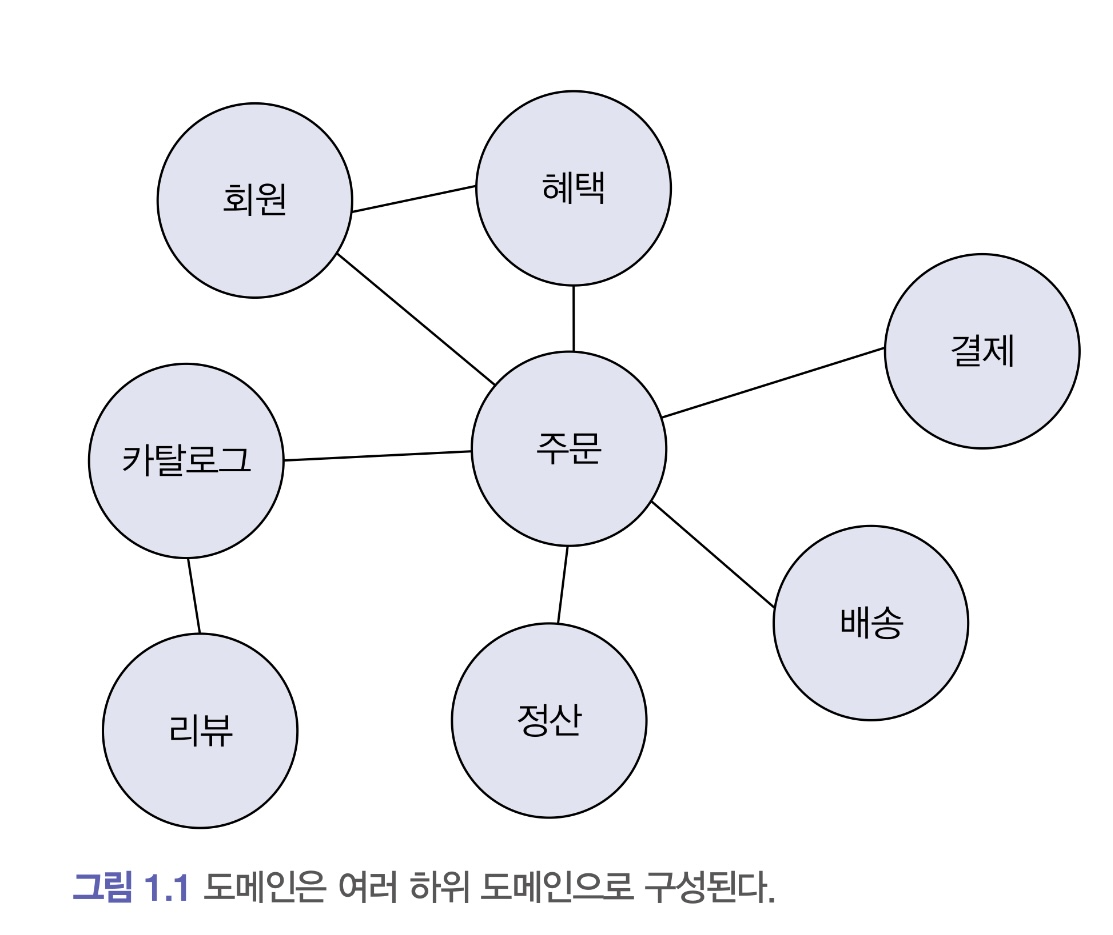 - ex) 고객이 물건을 구매하면 주문, 결제, 배송, 혜택 하위 도메인의 기능이 엮이게 된다.